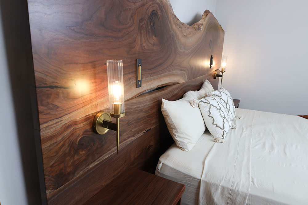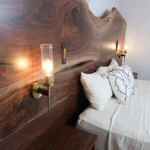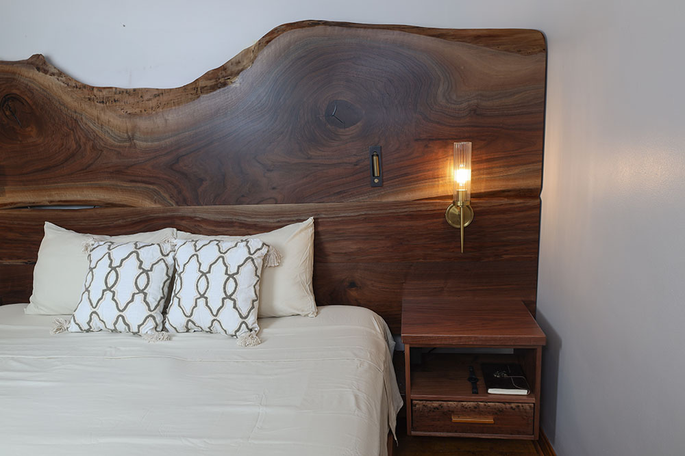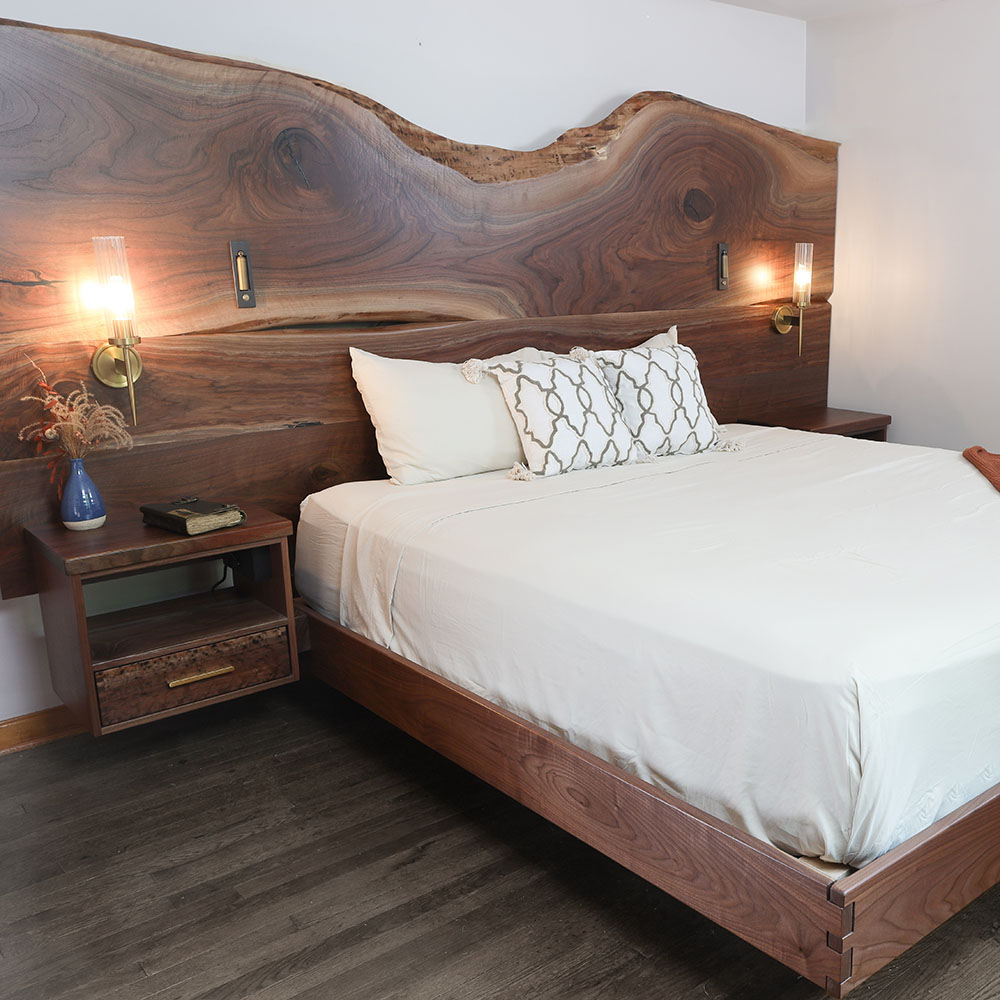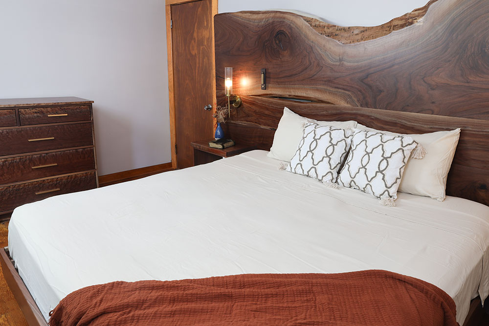 This custom Black Walnut king platform bed showcases the rich character and flowing grain that define premium walnut wood. The live edge headboard preserves the natural contour of the slab, creating a dramatic focal point that brings warmth and organic movement into the space. The solid hardwood walnut frame features handcut dovetail joinery, reinforcing both structural integrity and timeless craftsmanship.